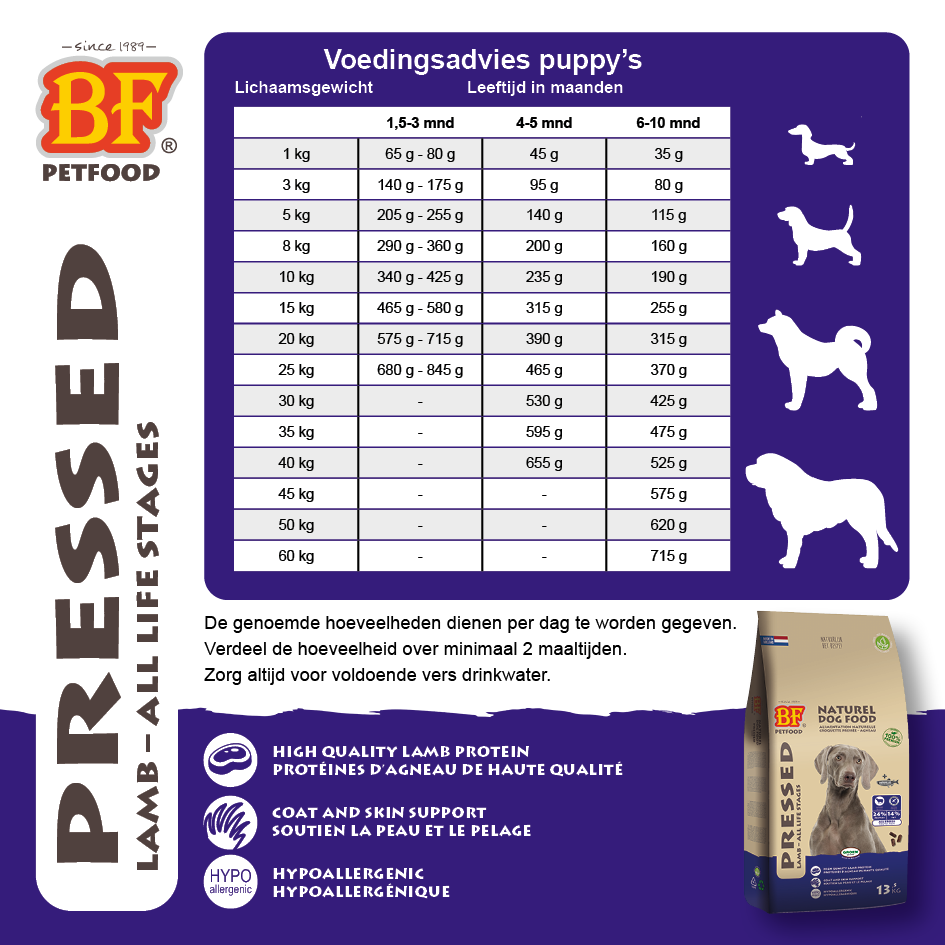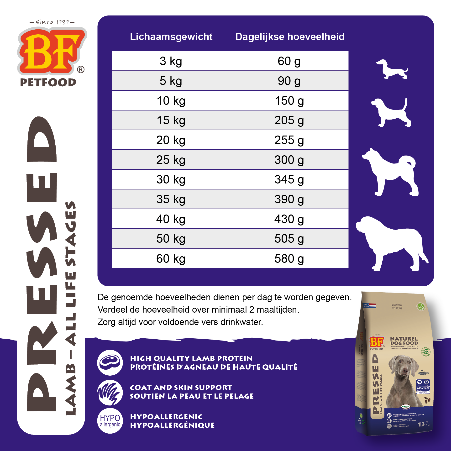 BF®Geperst Lam. Nederlandse topkwaliteit. Met hoogwaardige premium en natuurlijke grondstoffen. Volledige zeer goed verteerbare koud geperste all life stage hondenvoeding, geschikt van pup tot senior. Rijk aan lam (30%). Hypoallergeen (1 dierlijke eiwitbron: lam) en tarwe- en glutenvrij. Vezels ondersteunen de spijsvertering. Hoge acceptatie en verteerbaarheid. Voor voedingsgevoelige en/of kieskeurige honden en moeilijke eters. Ook geschikt voor drachtige en actieve honden. Lage maagbelasting en verhitting van de brok. Zonder chemische toevoegingen. Optimale voeding die zorgt voor een betere vertering, ontlasting en een goede conditie van uw hond. Voor alle hondenrassen en alle leeftijden.