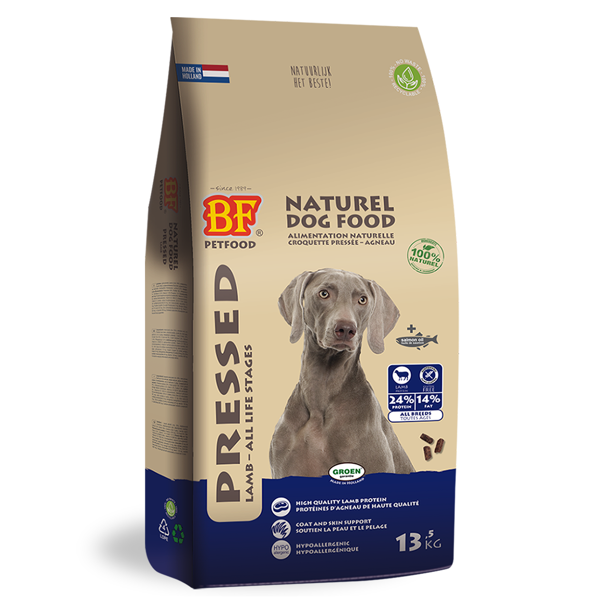 BF®Geperst Lam. Nederlandse topkwaliteit. Met hoogwaardige premium en natuurlijke grondstoffen. Volledige zeer goed verteerbare koud geperste all life stage hondenvoeding, geschikt van pup tot senior. Rijk aan lam (30%). Hypoallergeen (1 dierlijke eiwitbron: lam) en tarwe- en glutenvrij. De Schotse zalmolie, rijk aan omega 3 en 6, biedt ondersteuning voor huid, vacht, gewrichten en het immuunsysteem.......