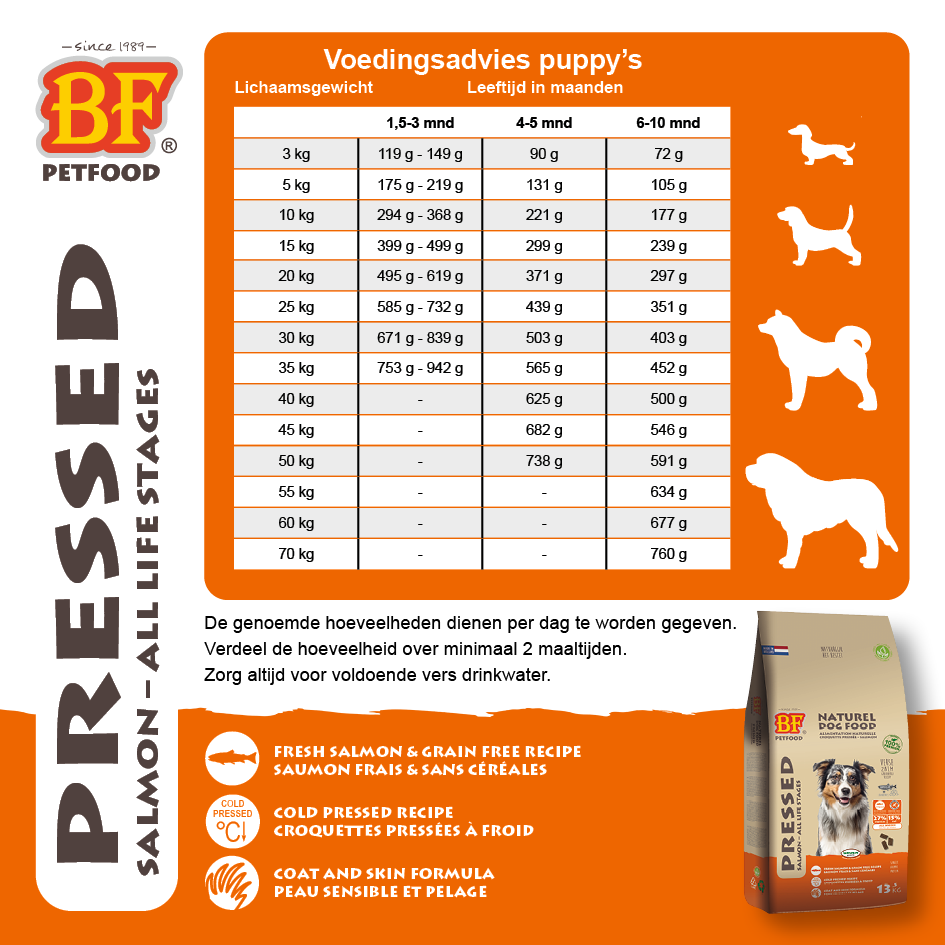 Onze BF® geperst zalm is een hoogwaardige volledige smaakvolle, graan- en glutenvrij natuurlijke hondenvoeding voor elke hond, van pup, adult tot senior. Voor normale, actieve en voedingsgevoelige en kieskeurige honden of moeilijke eters. Met naast verse zalm o.a. ook zalmolie, cranberry en een graanvrije formule. Gist, vezels en prebiotica ondersteunen de spijsvertering. Hoge acceptatie en licht verteerbaar. Bevat lekker veel Schotse zalm, vers en gedroogd, als enige dierlijke eiwitbron. Lage maagbelasting en verhitting van de brok. Inuline FOS (prebiotica) stimuleert de darmflora en ondersteunt hiermee de gezondheid. Ondersteunt huid en vacht, gebit en een gevoelige spijsvertering. Hondenvoeding die een optimale vertering, ontlasting en conditie van uw hond ondersteunt.