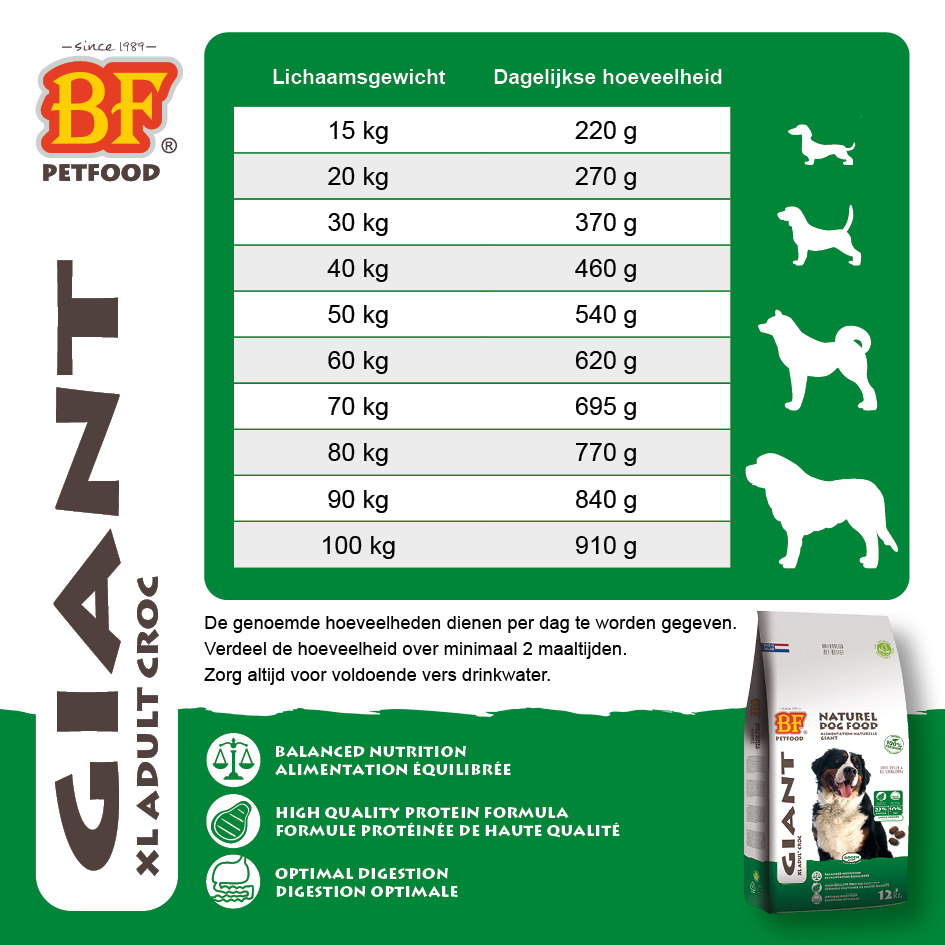 BF® Giant is een volledige licht verteerbare, premium en zeer smaakvolle natuurlijke hondenvoeding voor grote rassen en honden met schrokgedrag. Hoge acceptatie en verteerbaarheid. Meerdere dierlijke eiwitten. Ondersteund mobiliteit en gewrichten. Inuline FOS (prebiotica) stimuleert de darmflora en ondersteunt hiermee de gezondheid. Optimale voeding die zorgt voor een betere vertering, ontlasting en een goede conditie van uw hond. Voor alle grote hondenrassen en honden met schrokgedrag.