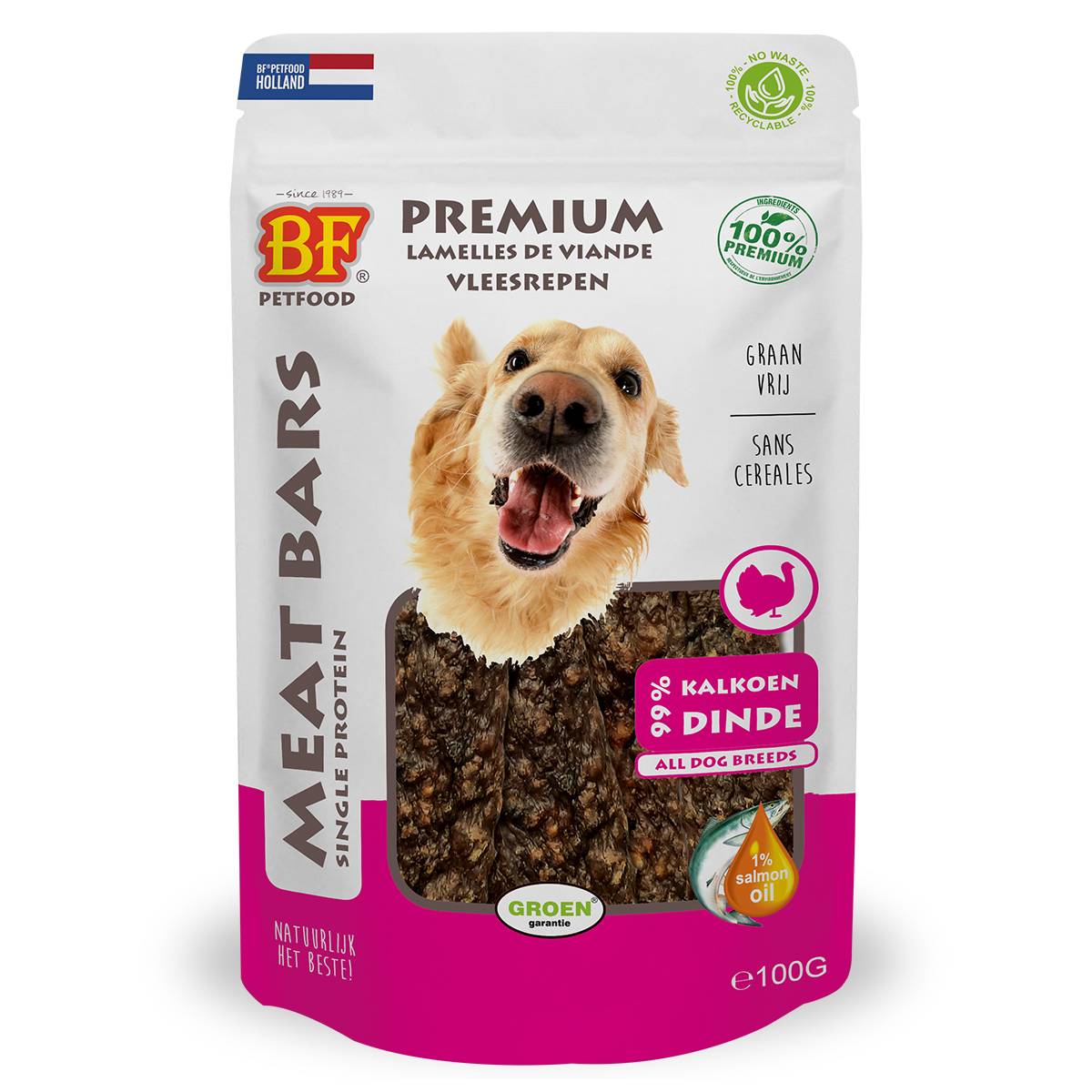 De BF® Meat Bars Kalkoen zijn premium vlees delicatesses voor iedere hond, van puppy tot senior. De smaakvolle en gezonde hypoallergene vleesrepen zijn een perfect uitgebalanceerde combinatie van gezonde ingrediënten van puur vlees en Schotse zalmolie. 100% natuurlijk, graan- en glutenvrij en zonder kunstmatige toevoegingen. Helpt een schoon gebit te bevorderen. Het droogproces voor deze snacks gebeurt op duurzame wijze. Dit alles met zo weinig mogelijk afvalproductie en CO2 uitstoot. Ze zijn gemakkelijk te breken waardoor je precies de juiste hoeveelheid kunt geven. Zowel volwassen honden als pups kunnen van deze heerlijke gezonde snack genieten.