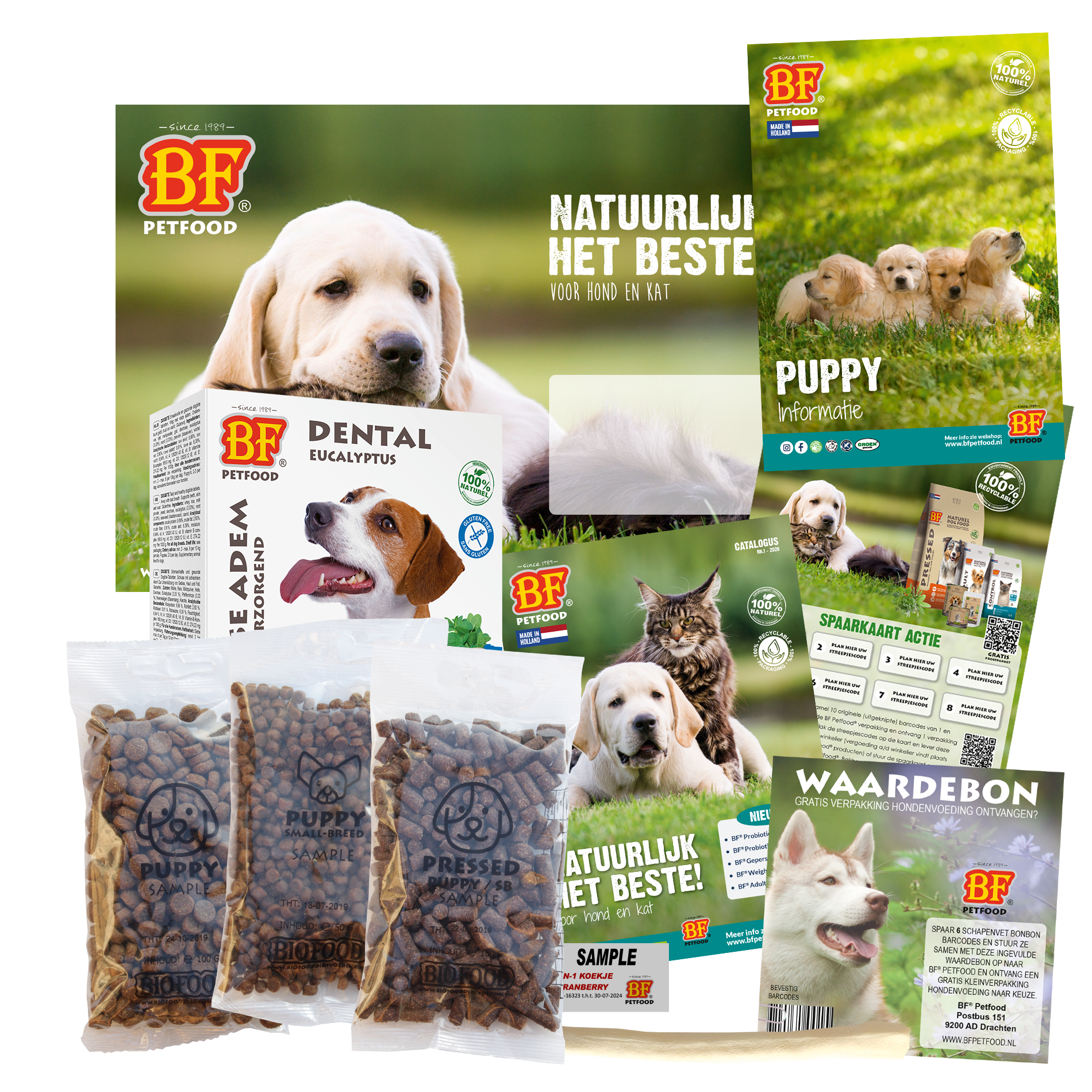De puppyfase is erg belangrijk en bepalend voor een krachtig, vitaal en gezond leven van uw hond. Ons BF® Puppypakket bevat alles wat een jonge, opgroeiende hond van nature nodig heeft. In het BF® Puppypakket vindt u alle soorten puppybrokken die we in ons assortiment hebben. Zo kunt u als kersvers baasje uitproberen wat het beste bij uw lieve viervoeter past. Het puppypakket zelf is GRATIS. U betaald alleen de verzendkosten.