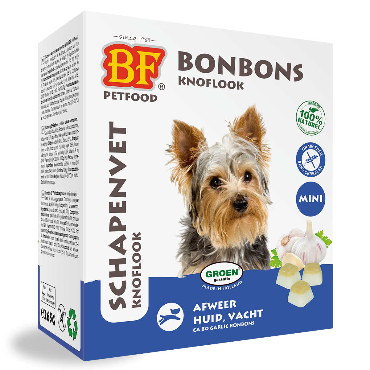 De originele BF® schapenvet bonbon knoflook mini is een natuurlijk en bijzonder probaat middel ter ondersteuning van afweer, huid, vacht, (spijs)vertering en weerstand. Natuurlijk en effectief. Met de natuurlijke werking van knoflook. Allicine uit knoflook, is een natuurlijk ingrediënt in dierverzorging. Het is tevens een uitzonderlijk gezonde en smaakvolle toevoeging op de dagelijkse voeding. Ook geschikt voor honden met een voedselallergie die een dieet krijgen op basis van lamsvlees.