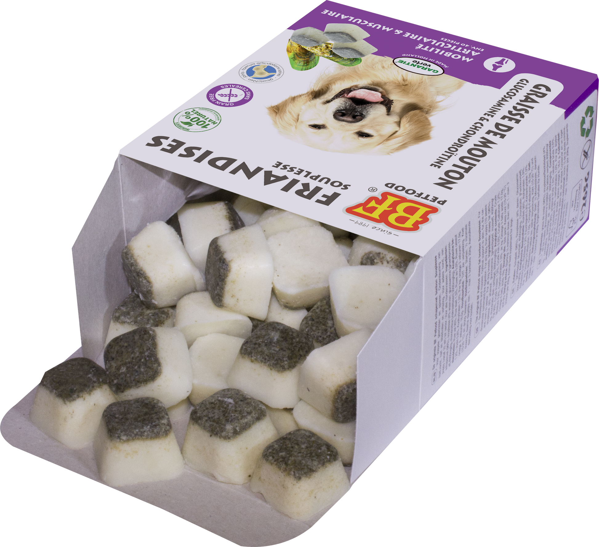 De originele BF® schapenvet bonbon Souplesse is een ware delicatesse voor iedere hond, van puppy (vanaf 10 wk) tot senior. Deze smaakvolle en gezonde Souplesse traktatie bevat een perfect uitgebalanceerde combinatie van gezonde ingrediënten: schapenvet en souplesse (chondroïtine uit viskraakbeen, glucosamine van groenlipmossel). Hoogwaardige eiwitten, aminozuren, vitaminen (A en D), omega 3 en 6 vetzuren, chondroïtine en glucosamine. Voor soepele gewrichten......