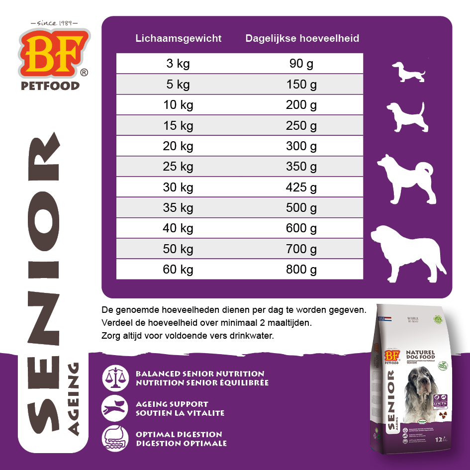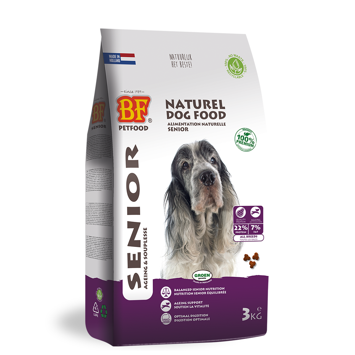BF® Senior is een volledige licht verteerbare en zeer smaakvolle premium en natuurlijke hondenvoeding voor de oudere hond. Ook geschikt voor honden die ondersteuning nodig hebben voor de nieren en/of de blaas. Met diverse dierlijke eiwitbronnen als kip, rund en zalm. Bevat o.a. gezonde zalmolie, cranberry, echinacea en glucosamine en chondroïtine. Vezels en prebiotica ondersteunen de spijsvertering. Hoge acceptatie en verteerbaarheid. Met effectieve inuline/FOS prebiotica. Gereduceerd energie-, eiwit-, vet- en mineralengehalte. Ondersteunt mobiliteit, gewrichten en de nieren. Vitamine E en selenium, een antioxidantcomplex, beschermt tegen celveroudering. Zonder chemische toevoegingen. Optimale voeding die zorgt voor een betere vertering, ontlasting en een goede conditie van uw hond. Voor alle hondenrassen.
