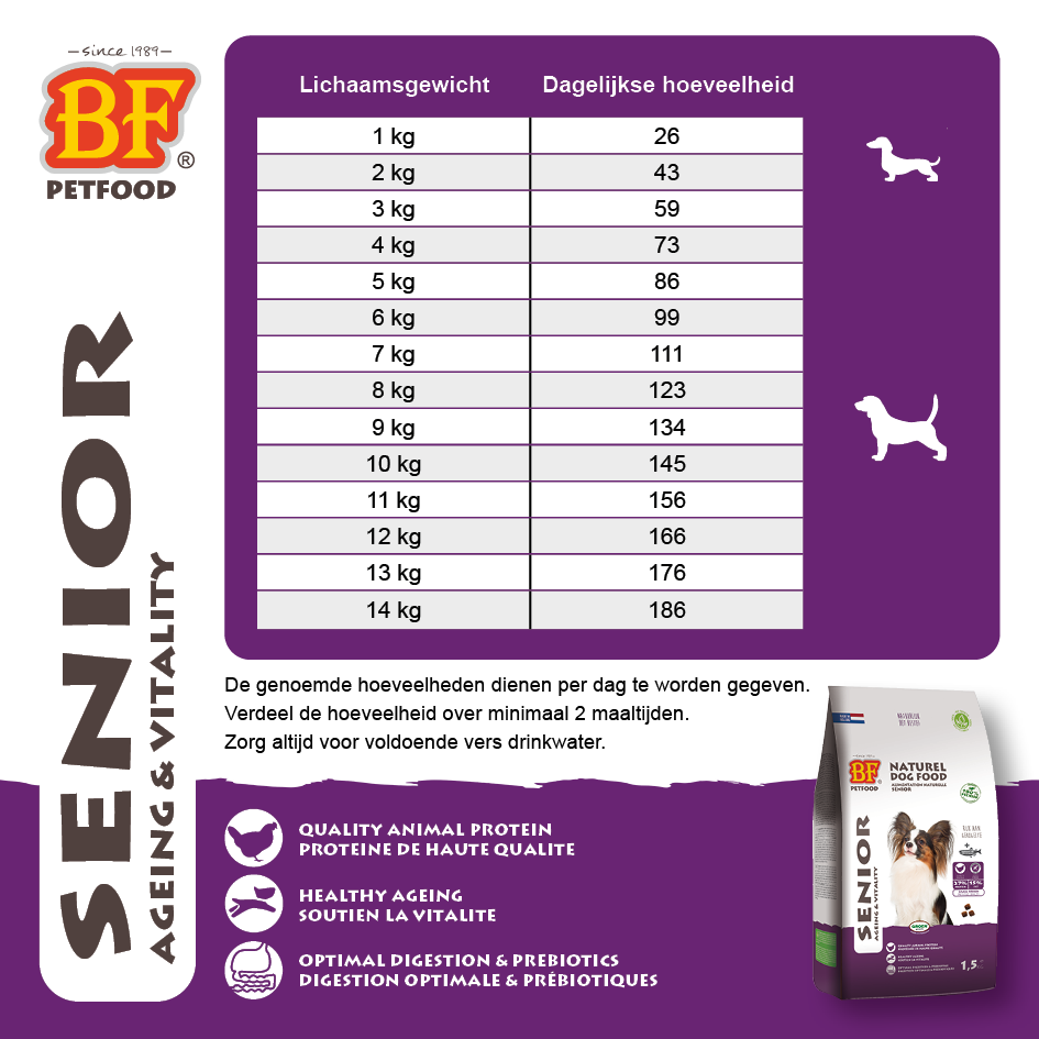 BF® Senior mini is een hoogwaardige volledige smaakvolle premium en natuurlijke hondenvoeding voor oudere honden van kleine rassen. Biedt tevens ondersteuning bij gevoelige nieren. Met gevogelte en rijst. Met zalmolie, chondroïtine en glucosamine. Tarwevrij formule. Hoge acceptatie en verteerbaarheid. Gist, vezels en prebiotica ondersteunen de spijsvertering. Optimale brokgrootte, -vorm en -structuur. Ondersteunt veroudering, vertering, mobiliteit, gewicht en huid en vacht. Inuline FOS (prebiotica) stimuleert de darmflora en ondersteunt hiermee de gezondheid. Met vitamine E, die bescherming kunnen bieden tegen celveroudering. Beperkt geur en volume van de ontlasting. Gezonde voeding die zorgt voor een optimale vertering, ontlasting en een goede conditie van uw hond.