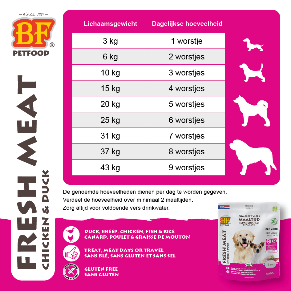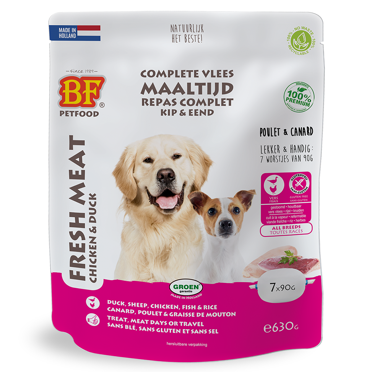 BF® Vleesvoeding kip/eend. Complete en houdbare pure hondenvoeding op basis van vers vlees (eend, kip en vis), orgaanvlees, rijst, schapenvet en natuurkruiden. Glutenvrij. Onze vlees maaltijden worden langzaam gestoomd met 100% verse en natuurlijke ingrediënten. Uitermate geschikt voor vleesdagen, als traktatie, voor onderweg, smaakmaker, bij omschakeling naar ander voer of voor honden die slecht reageren op droogvoeding. Met afsluitbare verpakking en handige portieverpakkingen (7x90g/630g). Geschikt voor iedere hond, van pup tot senior. Ook te verkrijgen als 800 g worst.