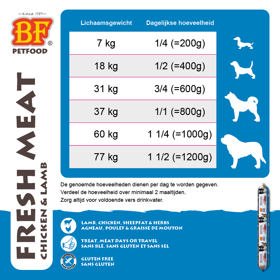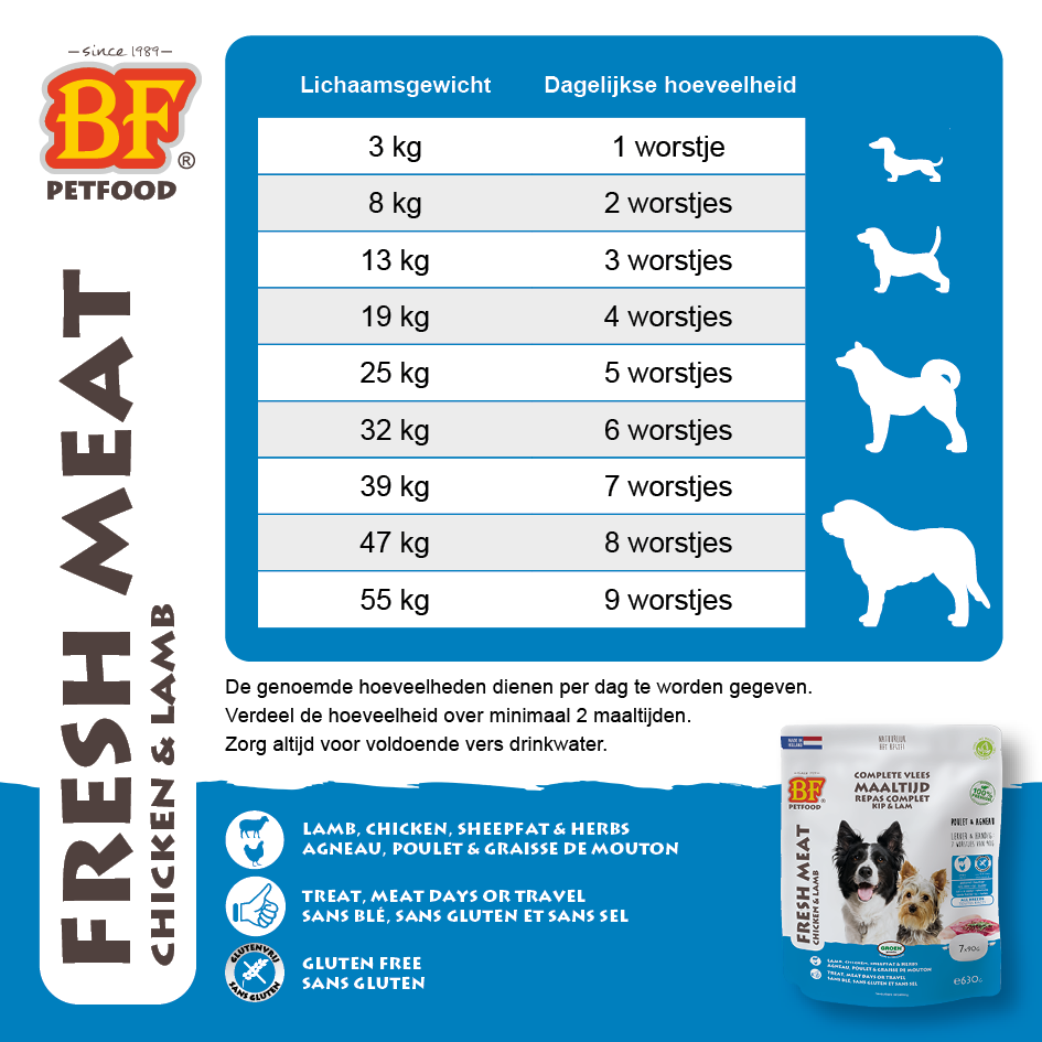 BF® Vleesvoeding kip/lam. Complete en houdbare pure hondenvoeding op basis van vers vlees (lam en kip), orgaanvlees, rijst, schapenvet en natuurkruiden. Glutenvrij recept. Onze vlees maaltijden worden langzaam gestoomd met 100% verse en natuurlijke ingrediënten. Uitermate geschikt voor vleesdagen, als traktatie, voor onderweg, smaakmaker, bij omschakeling naar ander voer of voor honden die slecht reageren op droogvoeding. Met afsluitbare verpakking en handige portieverpakkingen (7x90g/630g). Geschikt voor iedere hond, van pup tot senior. Ook te verkrijgen als 800 g worst.